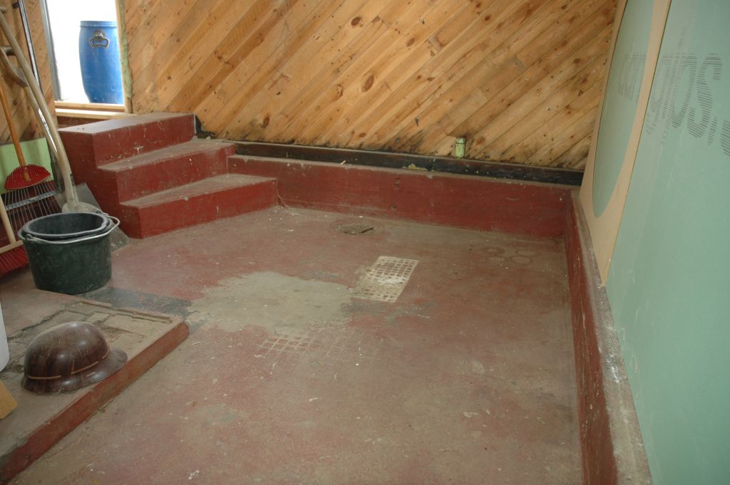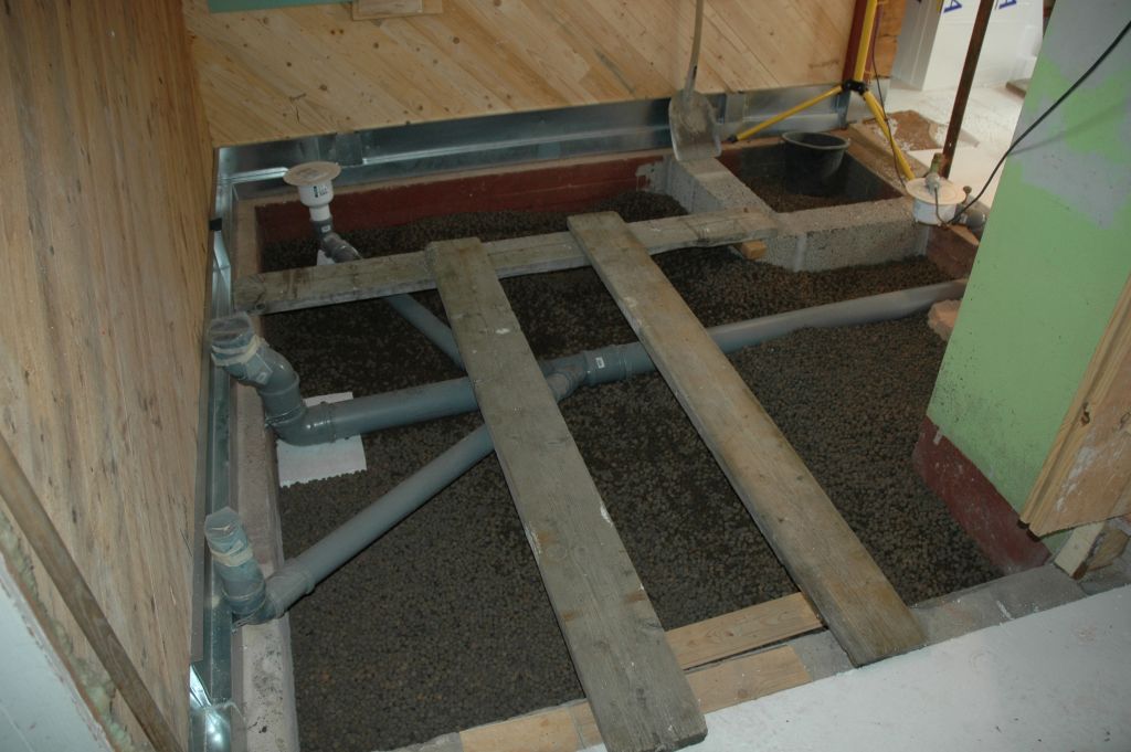 Här är det blivande badrummet fyllt med leca-kulor, och pusslet med att passa till isoleringen kan börja...