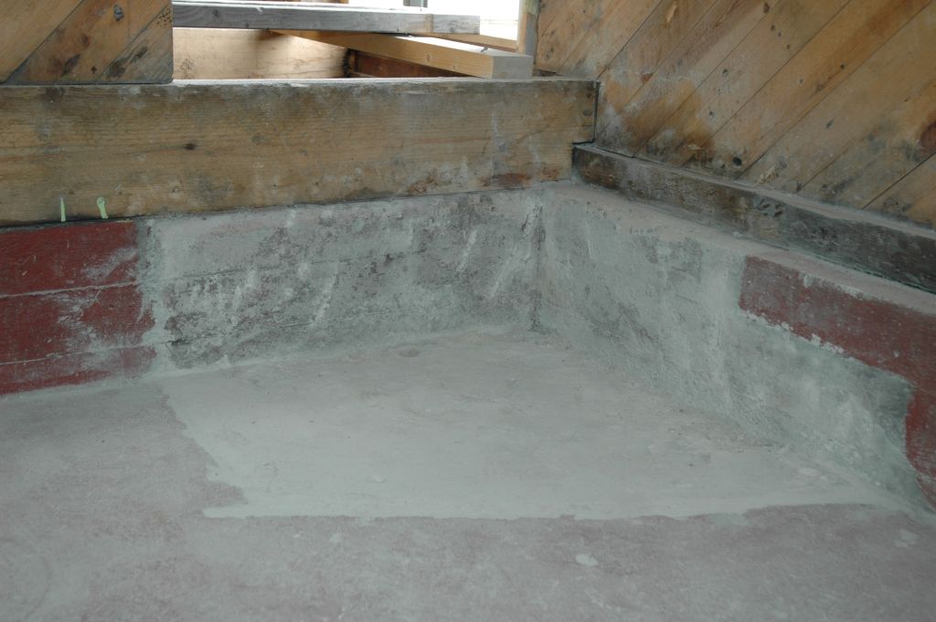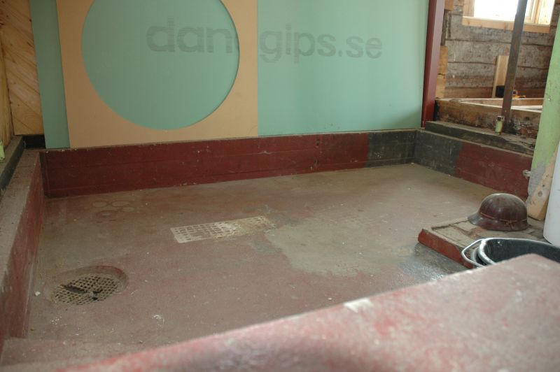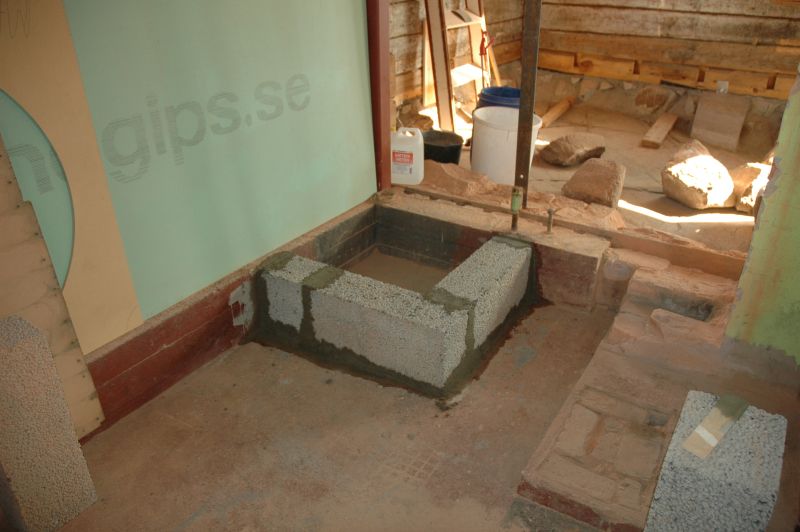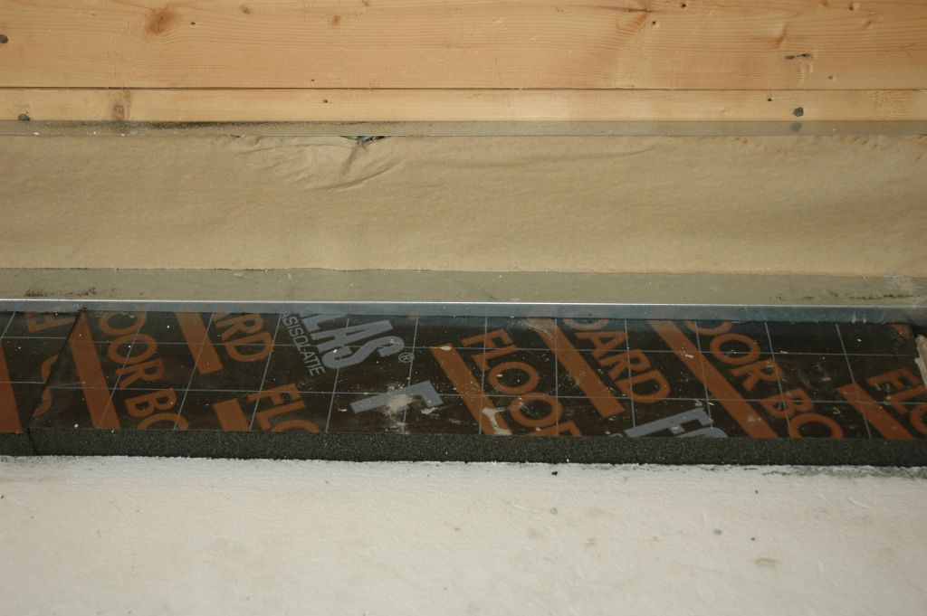 På sockeln runt köket är det lagt cellglas som valvet ska vila på. Detta för att undvika köldbrygga och uppvärmning av sockeln. Allt trä under "betongnivå" är plåtklätt. Plåten är sedan klädd med 17mm mineralullsboard för att tillåta rörelser i plattan.