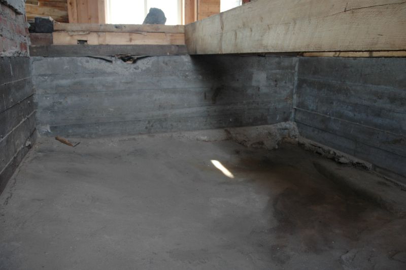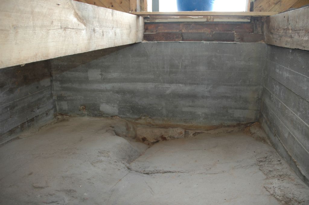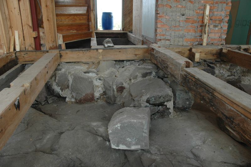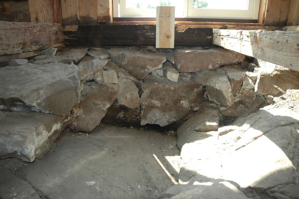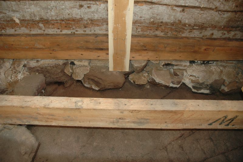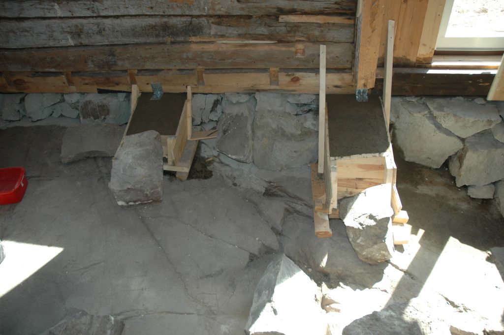 För att stabilisera stensockeln till den gamla stugan gjuts två stödmurar.