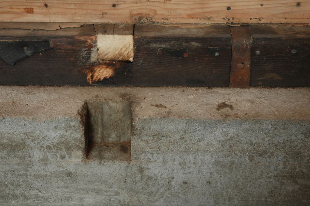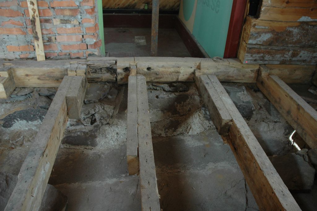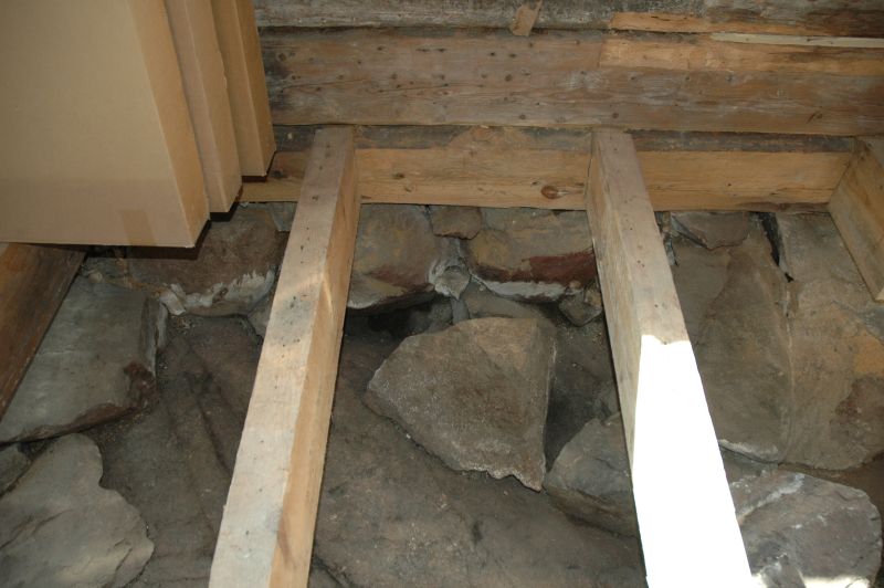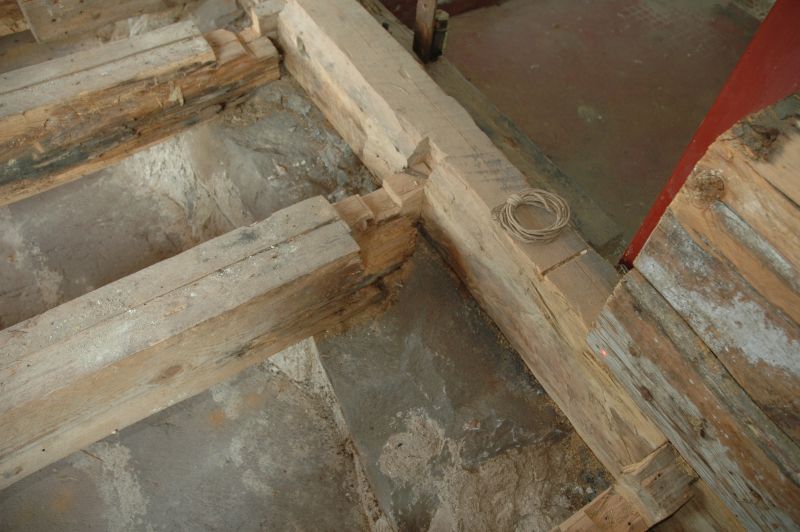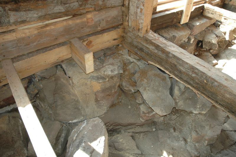 Golvbjälkarna i köket var hakade i både syll och sockel. Till höger på bilden syns en förankring av syllen i sockeln.