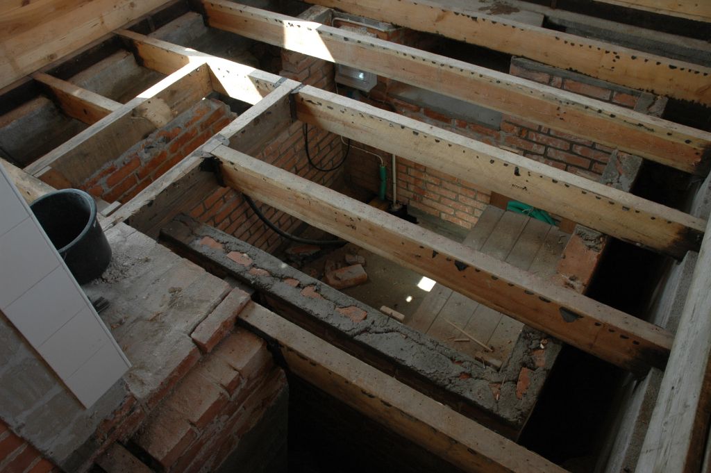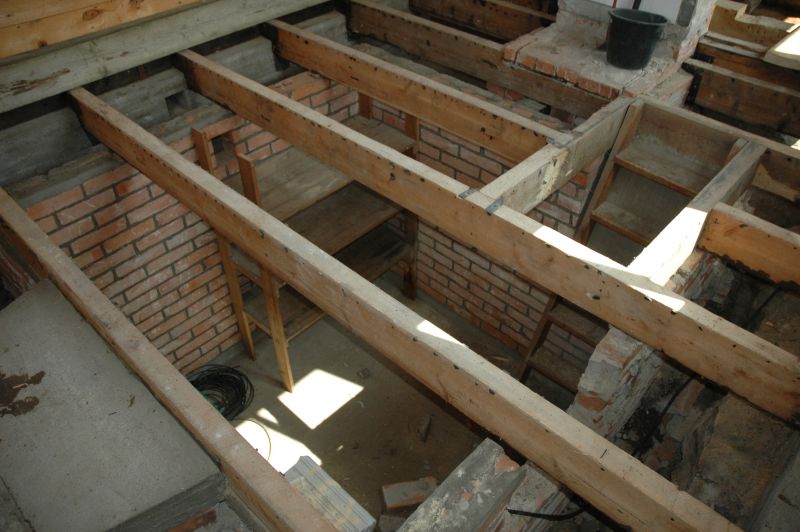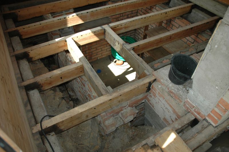 Med bjälklaget i köket borta syns matkällaren tydligt. De översta skiften på tegelmuren i matkällaren har avlägsnats för att få bättre svängrum när stämpet till betongvalvet ska byggas/rivas. El-centralens placering är temorär under renoveringen.