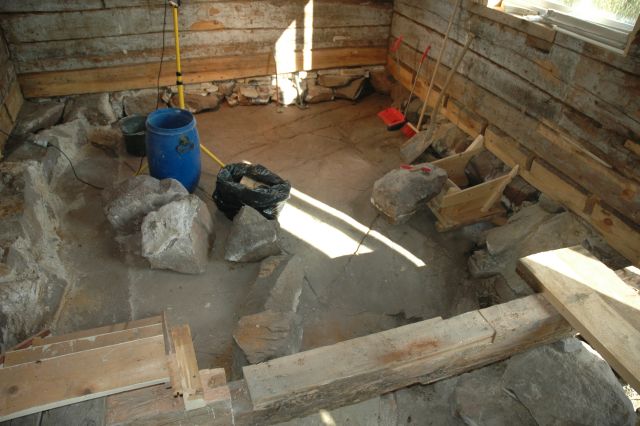 Syll och bottenstock är borttagna mellan gamla stugan och tornet. Bjälklaget är nu helt borta i g:a stugan. Både draglinorna till tornet och stolparna till konstruktionen som ersätter torn- och stugväggen är synliga.
