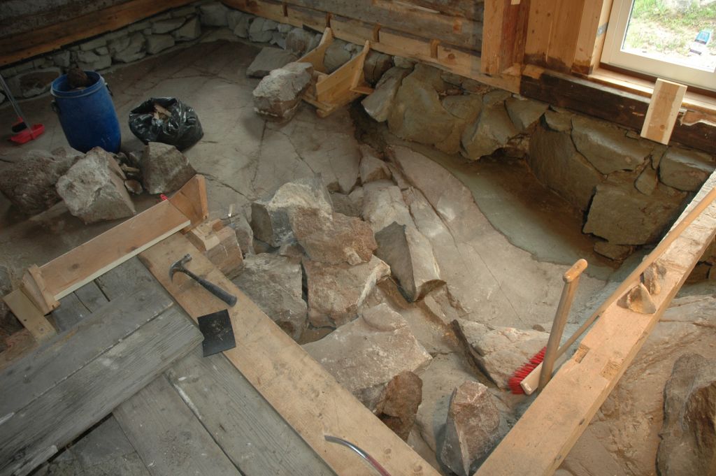 Stensockeln till den gamla stugan har rengjorts och slammats för att kunna förstärkas med betong. Det gamla kalkbruket var helt söndervittrat.
