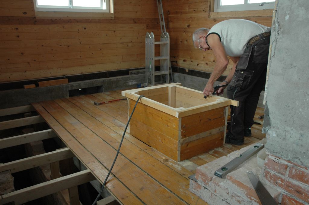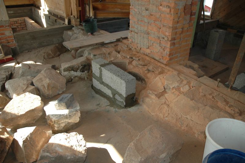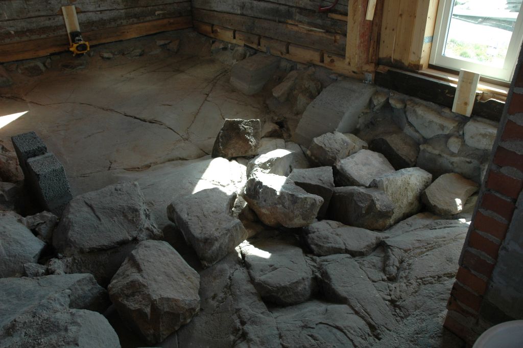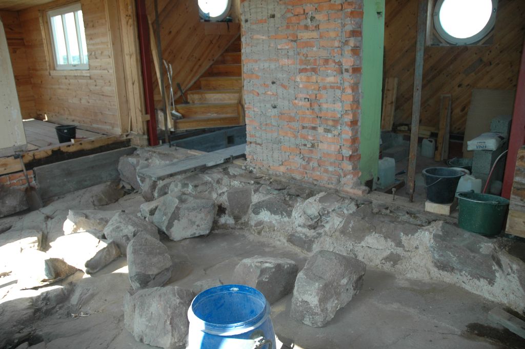 Eldstaden kommer att bli en inmurad kammin för att få det bästa av två världar, energieffektivitet kombinerat med utseende/känsla av en äldre öppen spis. Totalvikten kan mycket väl springa iväg och för säkerhets skull görs en förstärkning även under denna.