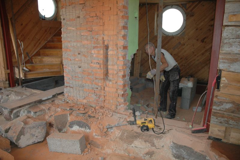 Murstocken i tornet hade en stuss för rökgaskanalen till en oljepanna. För att få lite mer plats i det planerade teknikutrymmet (acc-tank, FTX, reglersystem, mm) tas halva stussen bort.
