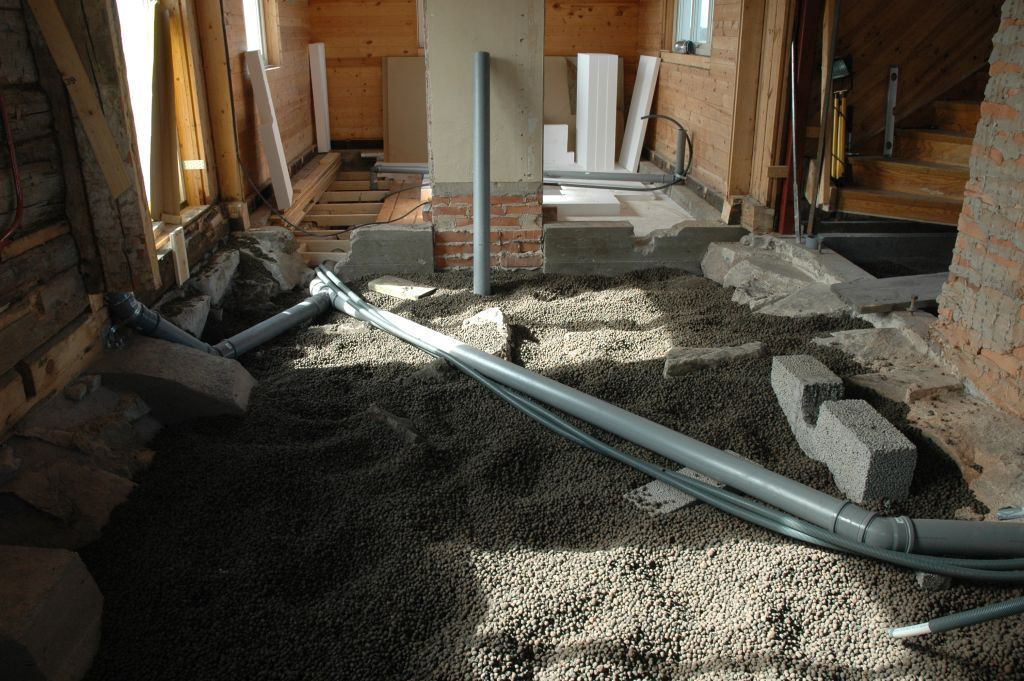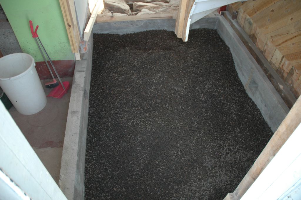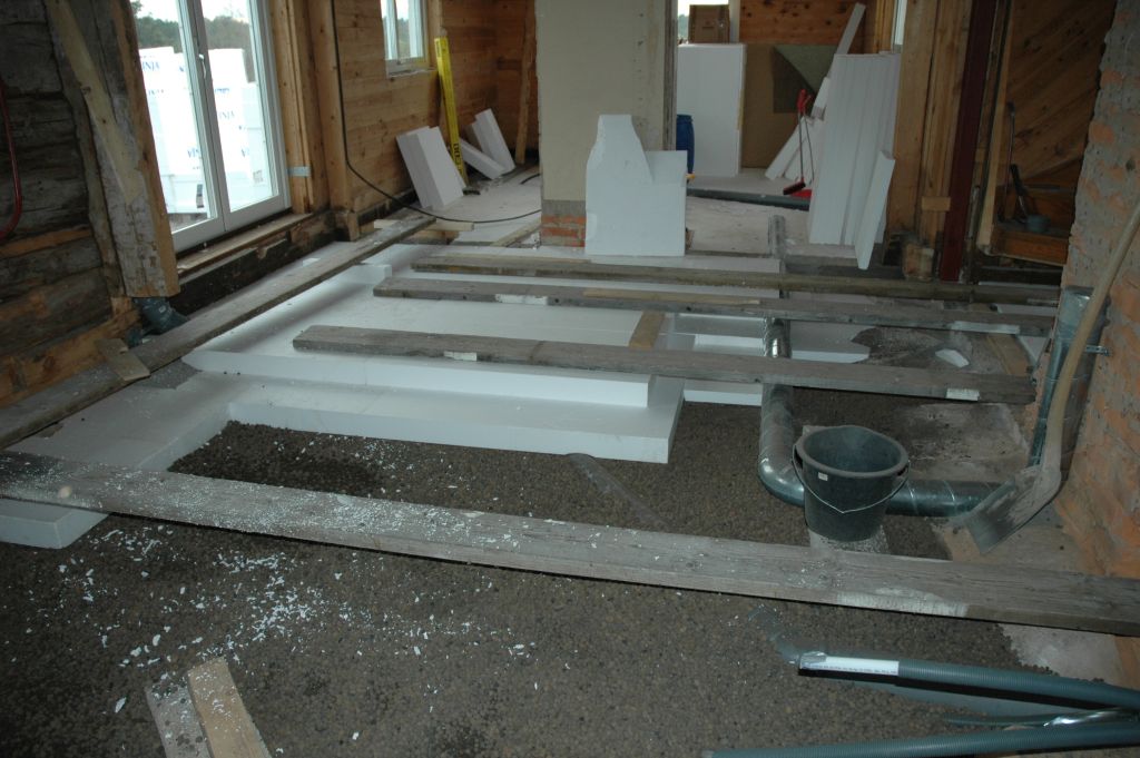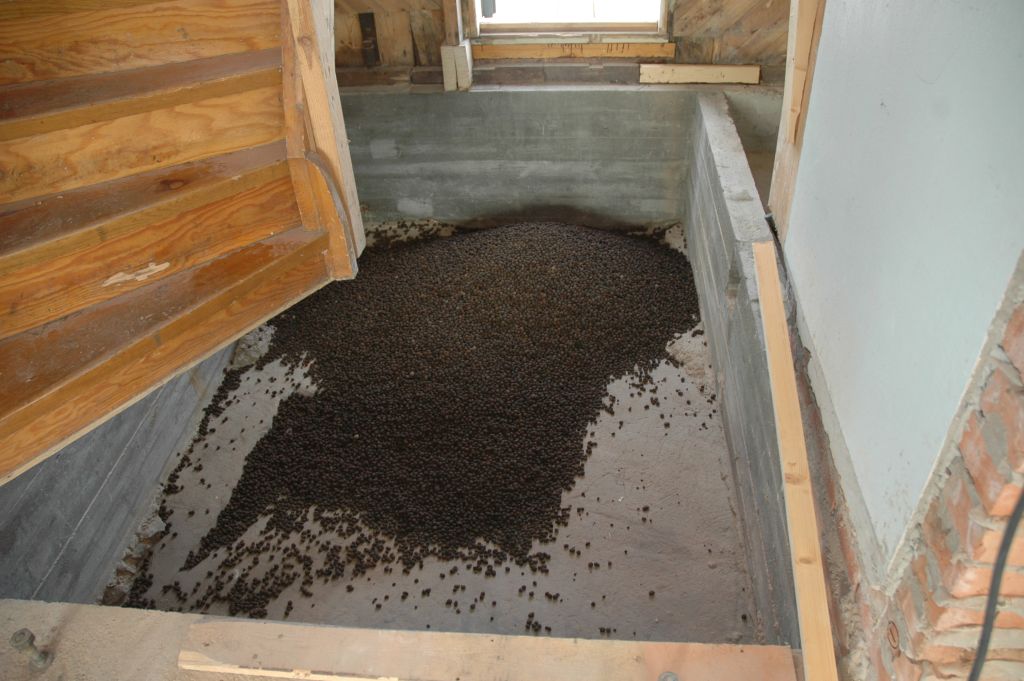 Stugan är delvis fylld med 2 m3 lecakulor. Likaså, har en del 1:a lagret isolering kommit på plats på gjutformen i köket.