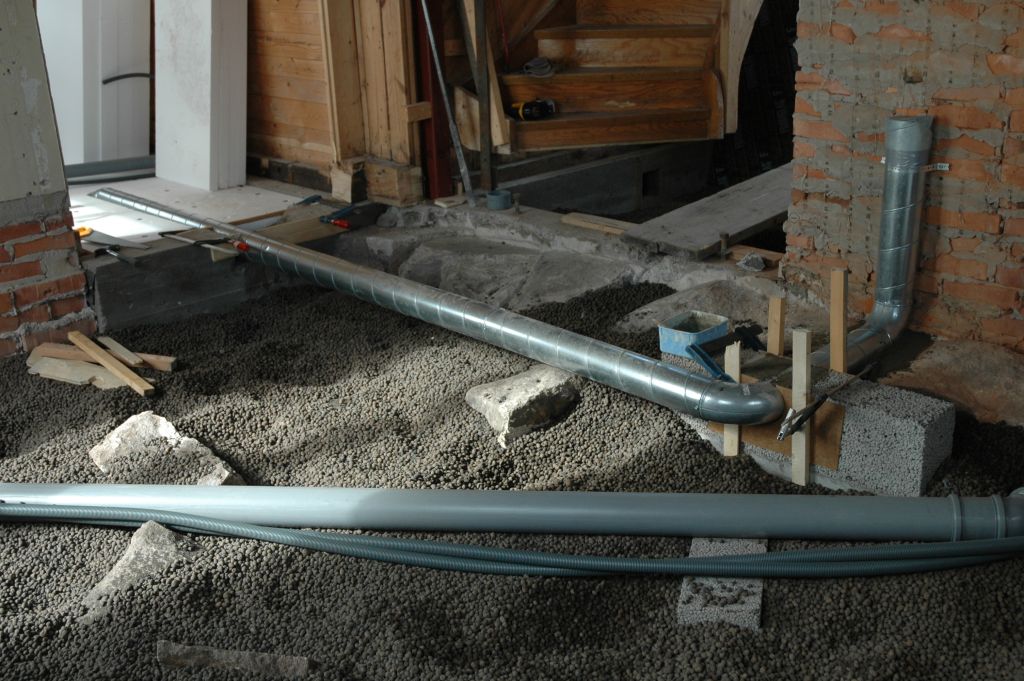 Kallvatten och avlopp draget i leca-skiktet under isoleringen i stugan. Varmvatten kommer att dras senare ovanpå isoleringen.