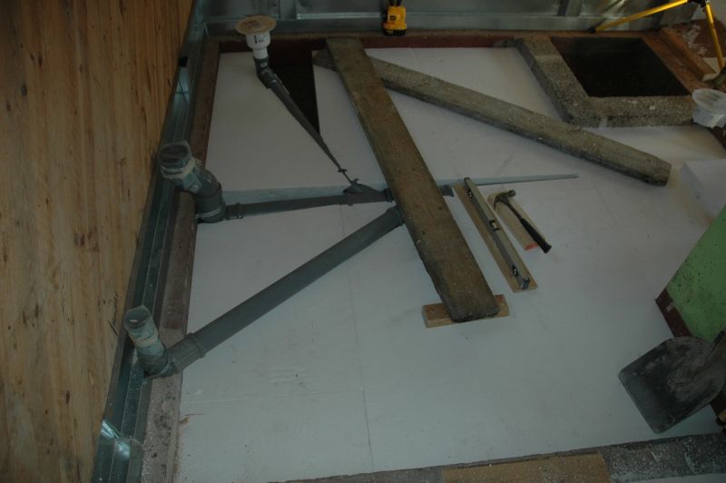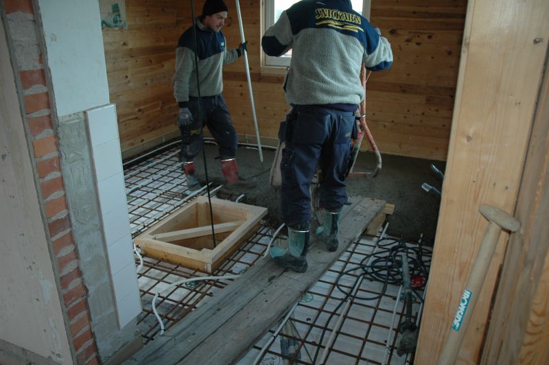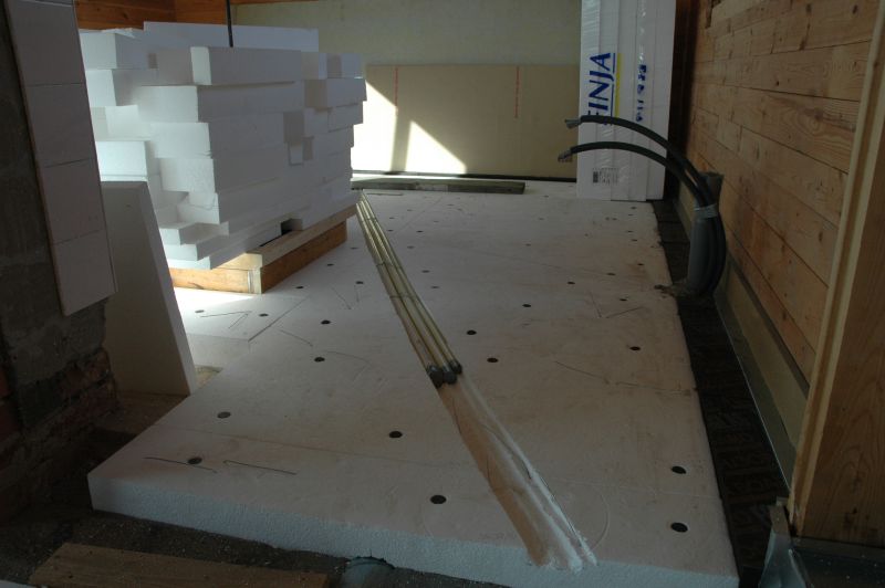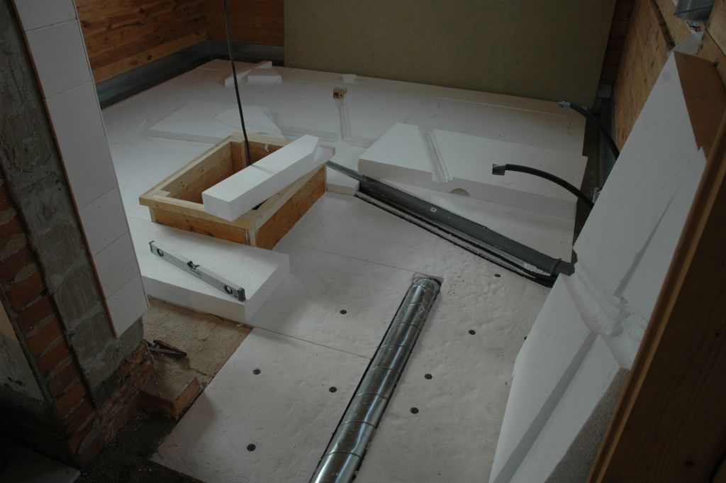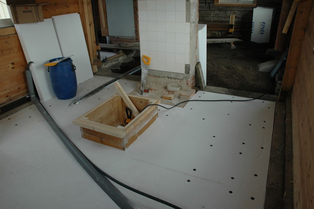 Här är badrummet färdigt för att lägga golvvärmeslingorna innan det blir armering och betong. I bakgrunden syns förstärkningssockeln med cellglas för accumulatortanken. I förgrunden är en plåt, som ska skilja betongplattorna åt, monterad. Nere till höger kommer elrören upp från centralen i matkällaren. Tanken är att huvudcentralen ska sitta i väggen mellan badrum och hall.