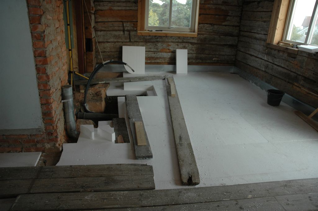 Att lägga isoleringen i stugdelen visade sig vara betydligt mer pill än väntat. Man kan ju inte gärna pulsa runt i lecakulorna och försöka få isoleringen i våg samtdigt. Därför arbetar vi uppifrån, så man först kan väga av lecan innan man lägger cellplasten. Men det som tar tid är att passa cellplasten mot alla ojämna ytor: den gamla stensockel, luftkanal, avlopp, etc...