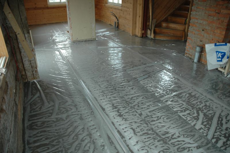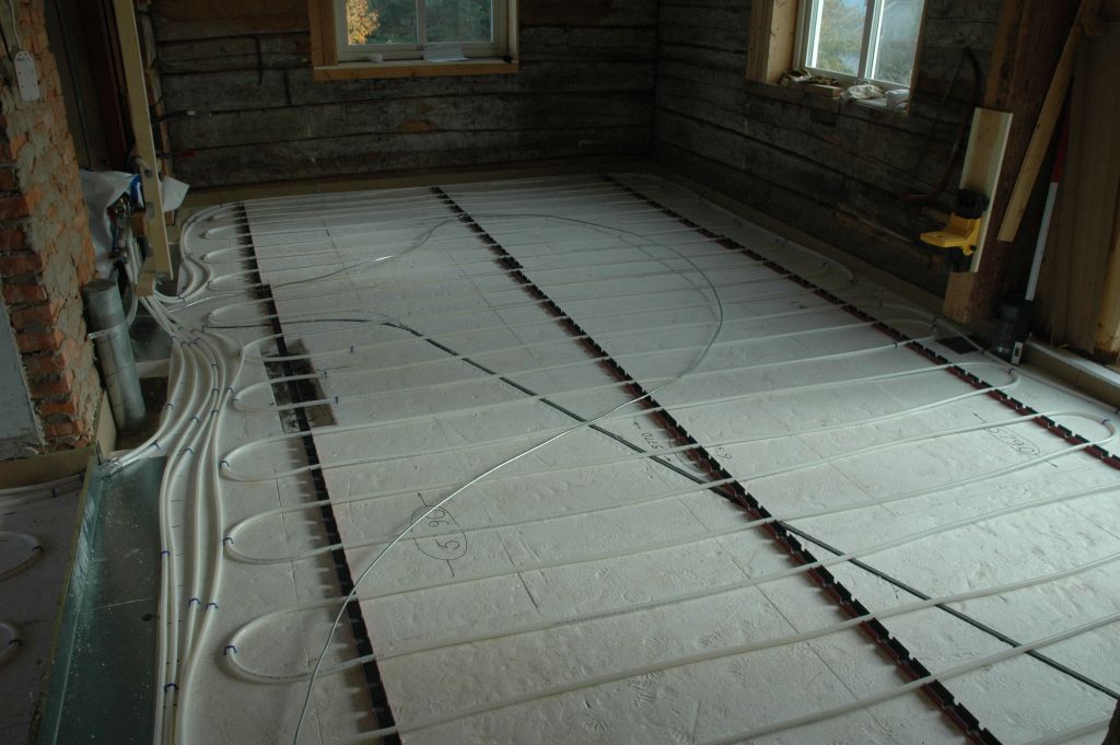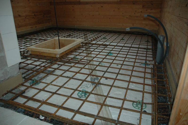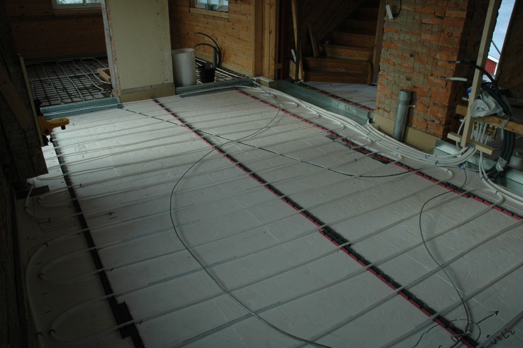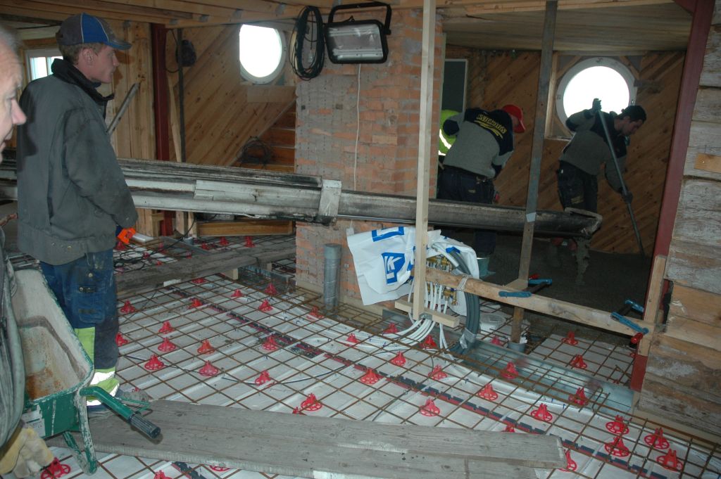Golvvärmeslingorna i stugan ligger direkt på isoleringen och hamnar alltså under armeringen. Detta eftersom det blir en friflytande betongplatta här.