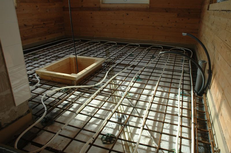 Över golvvärmeslingorna ligger en jordlina utlagd. Den ska så småningom fästas i armeringen i alla betongplattorna.