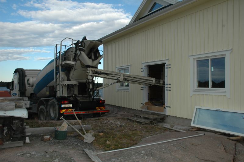 Betongbilen kunde back intill stugan och sticka in rännan genom altandörrarna.