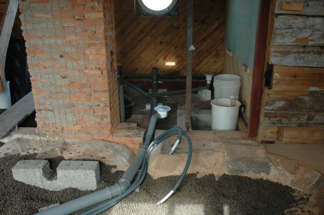 Här syns avlopp och golvbrunnar från blivande badrum och teknikrum.
