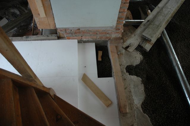 Underst syns fyllningen med leca-kulor. På den har två lager med isolering lagts. Ett lager isolering återstår, sen kommer armering och betong.