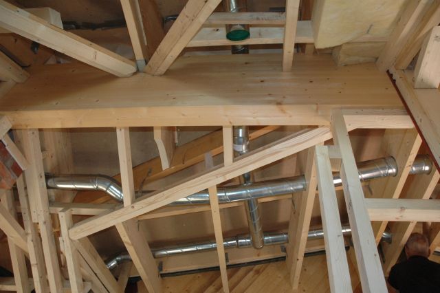 Det var en del tråcklande att få dit ventilationskanalerna i stugtaket. Överst i bild syns frånluftsuttaget i wc/dusch på 2:a våningen.