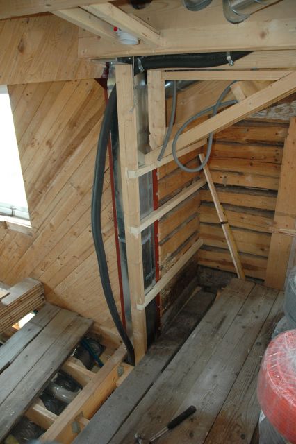 Ventilationskanalerna som går upp till plan 2 kommer att förse mer än halva huset med till- och frånluft. Tyvärr krävs en mindre påbuggnad för att få plats med dem. Samtidigt ska slangarna till det ena solpanelsparet kommer ner i samma trumma.
