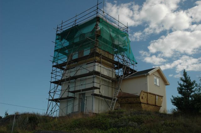 Den andra sommaren byttes panelen på den övre halvan av tornet. Här är stommen frilagd för att få en chans att torka ur.