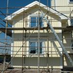 Härifrån har vind och regn piskat på med full kraft. På panelen var det tydligt vilken vindrikting som var svårast, nord-ost. På avstånd ser det inte så farligt ut. Det är bara masonitskivorna som avslöjar hur det förhåller sig.
